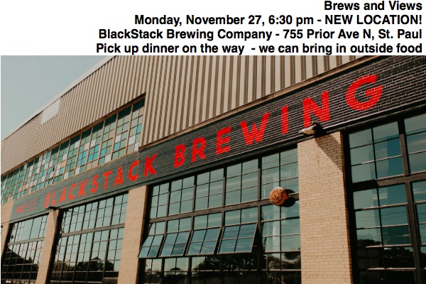 Join us Monday, Nov. 27, 6:30 – 8:30 pm, for Brews and Views at BlackStack Brewing in St. Paul!