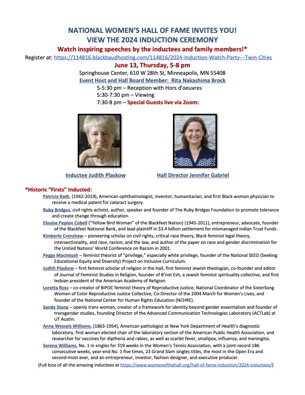The National Women’s Hall of Fame 31st Induction Ceremony celebrated the remarkable achievements of 10 extraordinary changemakers. Please join FCC Member Rev. Dr. Rita Brock, National Women’s Hall of Fame board member, and 2024 Inductee Judith Plaskow for a viewing party of this historic event. Tickets are $10/each.