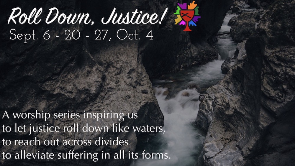 Starting Sept. 6, our new worship series is “Roll Down Justice”. This series is inspired by Amos, a prophet whose message is that God calls us to let “justice roll down like waters.” Worship without justice is not acceptable, rather our songs must move us to action on behalf of the oppressed. Through the powerful music of Mark Miller and the remembrance of our rituals of baptism, this series will offer us reflection and renewed inspiration to let our voices be tuned to the heart of the Gospel–proclaiming God’s love for all people. What prejudices are we challenged to “give up,”, and further, how are we willing to give of ourselves for the sake of the world?