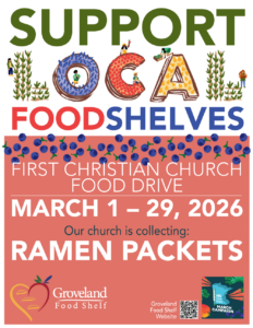 March is Minnesota FoodShare month and First Christian is calling on YOU to collect Ramen packets for the Groveland Food Shelf. Why this one item? It’s a game-changer for those who need it most! Their faces light up when they can select special treats like this! Our goal is to collect at least 200 packets of ramen.
