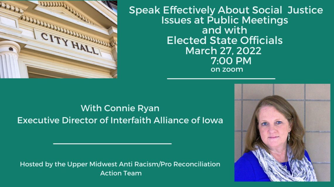 Join the Upper Midwest AR/PR Action Team for a discussion on how to speak effectively on social justice issues at public meetings and with State government officials. Connie Ryan, Executive Director, Interfaith Alliance of Iowa will lead us in our discussion.