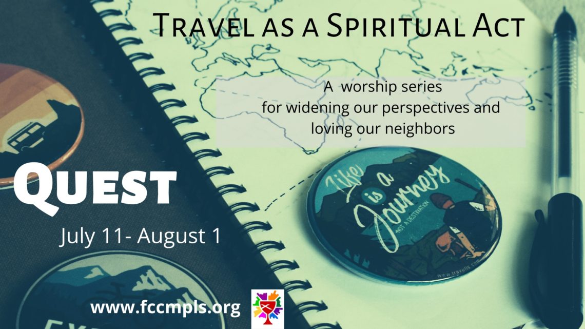 The process of exploration, discovery, and transformation that occurs when journeying to a new place or state of mind is the theme of “Quest: Travel as a Spiritual Act.” This four-week series may help you lay the groundwork for journeys of all kinds, physical and spiritual, as you prepare to encounter new people, new perspectives, new ways of life.
